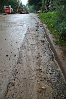 Photo also shows construction phasing--retaining as much pavement as possible to minimize mud. The gravel on left is to protect the terrace, where the curb has been damaged.