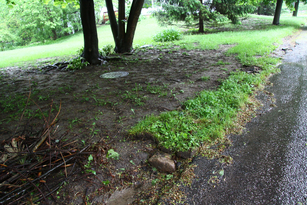 A terrace--without a curb and on a steep hill--was eroding. Erosion was caused by shade too dark for grass to grow, and made worse by people parking beyond the pavement.